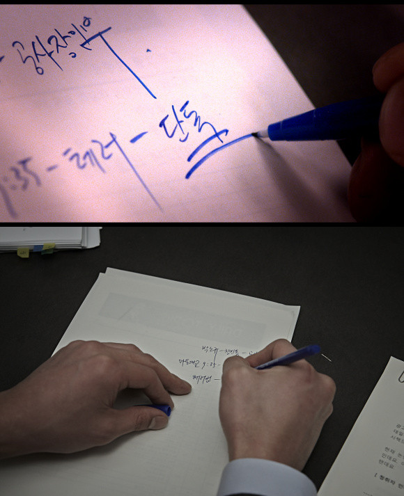 초반 마포대교가 실제로 폭발한 것을 목격한 후 테러범과의 대화를 기억해 내 단서를 써내려 가는 장면과 대테러센터 박정민 팀장에게 테러범의 위치에 대한 중요한 단서를 짚어주는 장면에서도 실제 하정우의 글씨가 쓰였다.