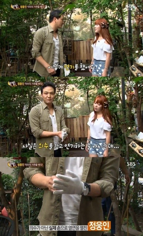 정웅인은 극중 민준국처럼 왼손에 목장갑을 낀 후 “이런 식으로 연기했다”며 리포터 앞에서 손연기를 재연해 눈길을 끌었다.