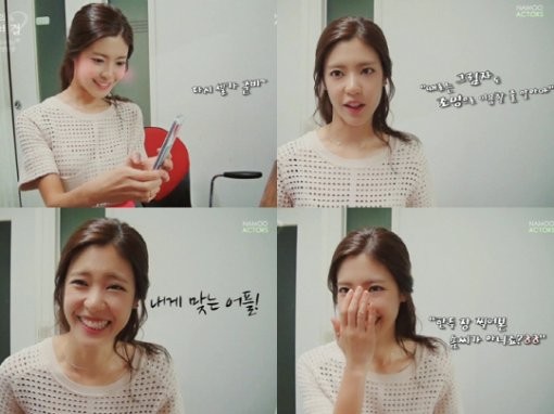 공개된 영상은 KBS2 새 주말드라마 <왕가네 식구들> 포스터 촬영현장에서 찍은 것으로 이윤지는 휴식시간 중 셀카비법을 전수하고 있다.