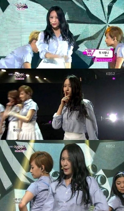 걸그룹 에프엑스의 크리스탈이 흑발로 변신했다.에프엑스는 지난 16일 방송된 KBS 2TV <뮤직뱅크>에 출연해 정규 2집 앨범 타이틀 곡 [첫 사랑니](Rum Pum Pum Pum)의 무대를 꾸몄다.