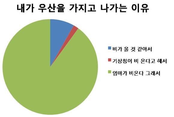 그래프에 따르면 80% 이상을 차지하는 답변은 “엄마가 비 온다고 해서”가 꼽혔다. 이어 “비가 오 것 같아서”, “기상청이 온다고 해서”라는 답변이 차지했다. 이는 기상청의 예보보다 엄마의 말을 더 신뢰한다는 놀라운 결과를 보여준다.