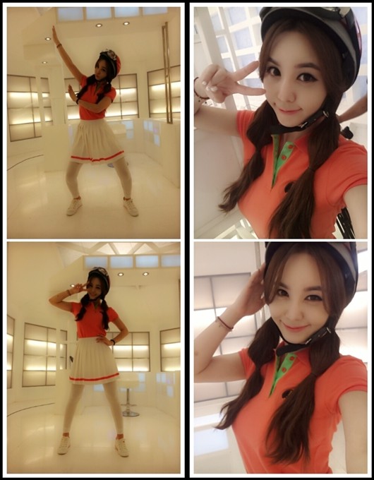공개된 사진 속 강예빈은 주황색 카라티와 흰색 치마에 레깅스를 입고 양갈래 머리에 헬멧까지 착용한 채 [빠빠빠] 댄스를 선보이고 있다. 특히, 깜찍한 브이와 함께 강예빈의 상큼한 미모가 눈길을 사로잡는다.