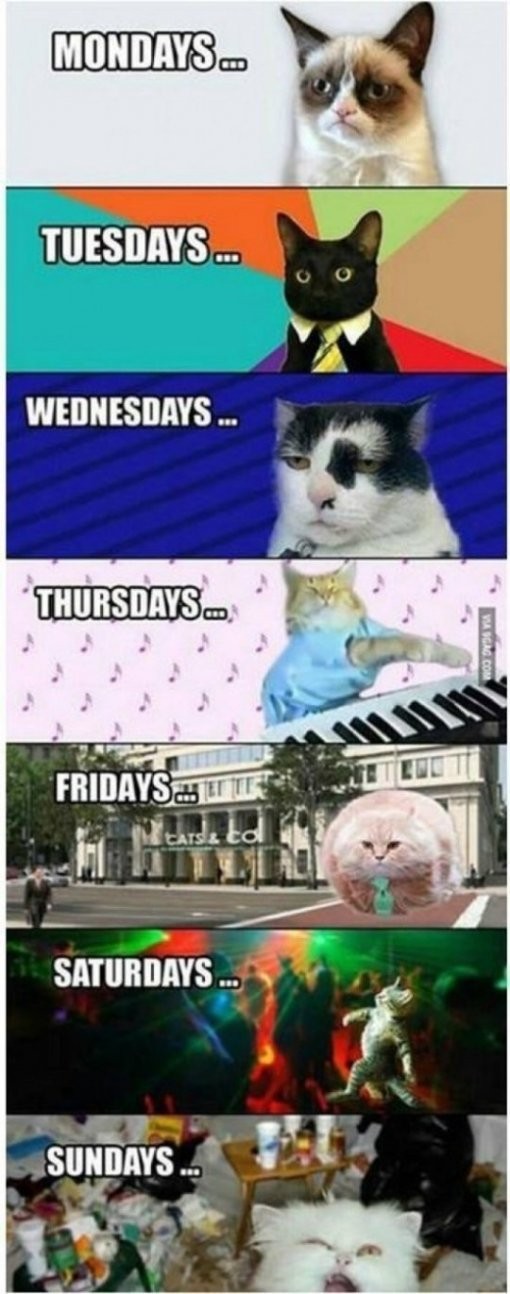 공개된 사진에는 요일별 고양이의 표정이 담겨 있다. 고양이는 월요일부터 수요일까지는 지치고 우울한 표정을, 목요일과 금요일엔 주말을 기대하며 즐거워하는 표정이 역력하다.