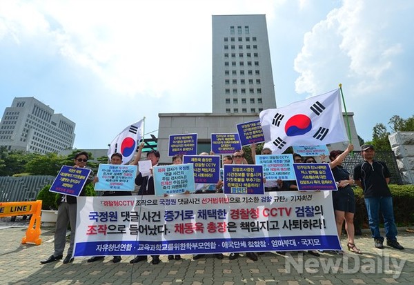 <국정원 댓글사건 증거인 경찰청 CCTV를 조작한 검찰규탄> 긴급 기자회견이 19일 오후 서울 서초구 대검찰청 앞에서 진행됐다.이날 기자회견에서 <자유청년연합>,<애국단체 참참참>,<교학연>,<엄마부대>,<국지모> 등 애국단체는 채동욱 검찰총장의 사퇴를 요구하는 성명서를 발표했다.