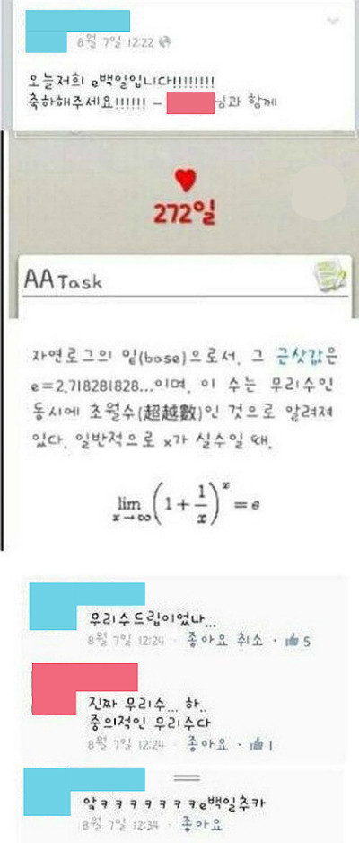 이어 “자연로그인 밑(base)으로서 근삿값은 e=2.718...이며, 이 수는 무리수인 동시에 초월수인 것으로 알려졌다. 일반적으로 x가 실수일 때”라는 수학공식을 설명했다. 이에 이백일 축하가 아닌 272일을 기념하는 [e백일]이었던 것.