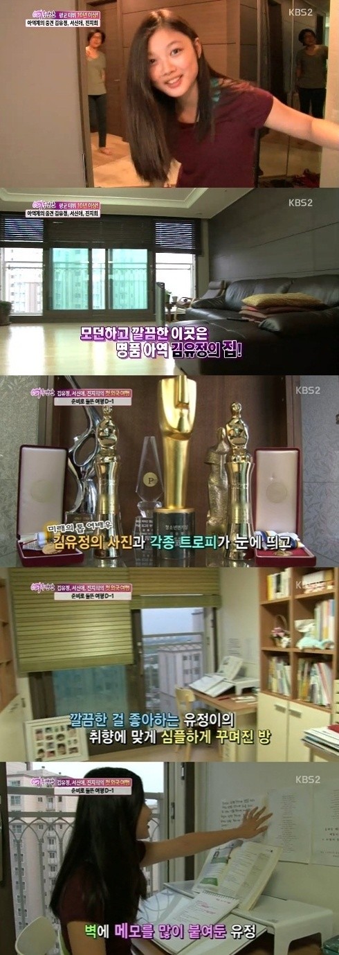 김유정 방은 15살 중학생답게 수많은 참고서와 책들로 가득했으며, 책상 앞 벽에 붙어 있는 많은 메모가 눈길을 끌었다. 이에 김유정은 “메모는 지키고자 하는 것과 실천할 일들을 써서 붙여놓은 것”이라고 밝혀 그녀의 성실함을 확인할 수 있었다.