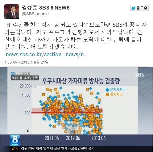 김성준 앵커는 21일 새벽 자신의 트위터에 “‘日 수산물 현지검사 잘 되고 있나?’ 보도관련 SBS의 공식 사과문입니다. 저도 프로그램 진행자로서 사과드립니다. 진실에 최대한 가까이 가고자 하는 노력에 대한 신뢰에 금이 갔습니다. 더 노력하겠습니다”라는 글을 올렸다.