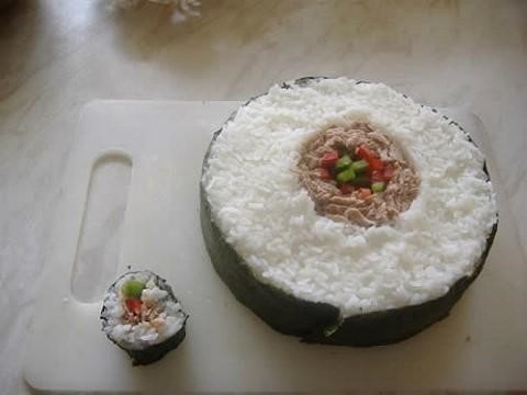 공개된 사진에는 엄청난 크기의 참치 김밥이 도마 위에 올려져 있다. 특히, 초대형 김밥 옆에 우리가 흔히 먹는 일반 김밥이 나란히 있어 초대형 김밥의 크기를 짐작케 한다.