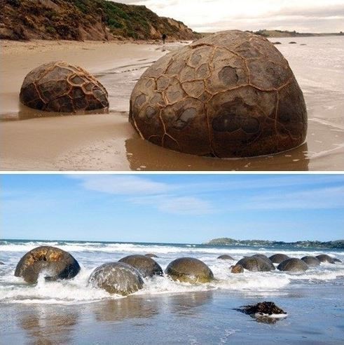 공개된 사진은 뉴질랜드 코에코헤 해변의 모습을 담은 것이다. 사진 속에는 지름 1~6미터 크기의 돌덩어리 수백 개가 해변에 놓여 있으며, 실제 제일 큰 바위는 무게가 7t이나 된다.