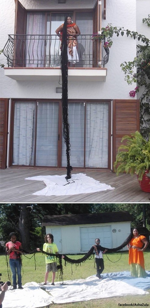 해당 사진의 주인공은 트리니다드 토바고 출신의 50세 아샤 만델라로 현재는 미국 뉴욕에 살고 있다. [검은 라푼젤]로 불리는 그녀는 세계 기록 17m 모발을 25년 동안 기른 것으로 알려졌다.