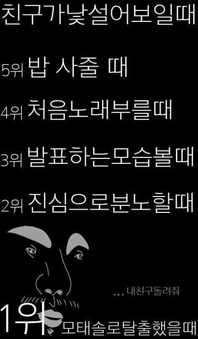 공개된 게시물에는 “친구가 낯설어 보일 때” 순위가 1위부터 5위까지 소개돼 있다. 5위 밥사줄 때, 4위 처음 노래 부를 때, 3위 발표하는 모습 볼 때, 2위는 진심으로 분노할 때이다.