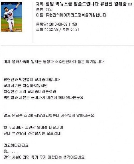 "류현진이 박한별과 교제 중"이라는 뜬금없는 얘기를 퍼뜨렸다.류현진과 박한별이 교제 중이랍니다.