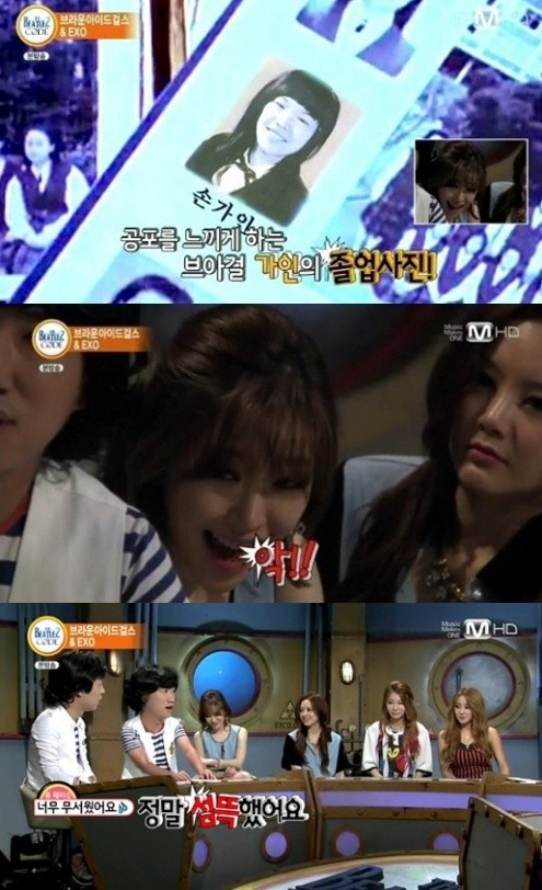 이날 브아걸과 엑소 평행이론이 펼쳐진 가운데, 공포영화 속 귀신 이야기를 하며 공포 분위기를 조성했다. 이때 가인의 고등학교 졸업사진이 공개됐고, 이를 본 가인은 고개를 숙인 채 “악!”이라며 비명을 질렀다.