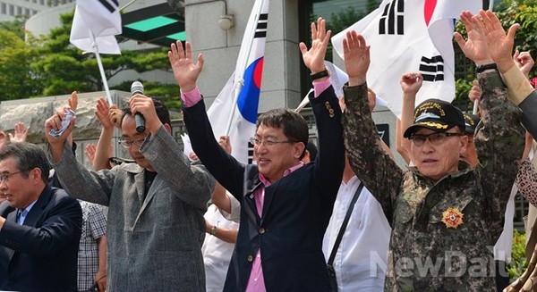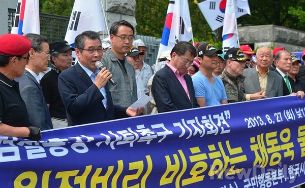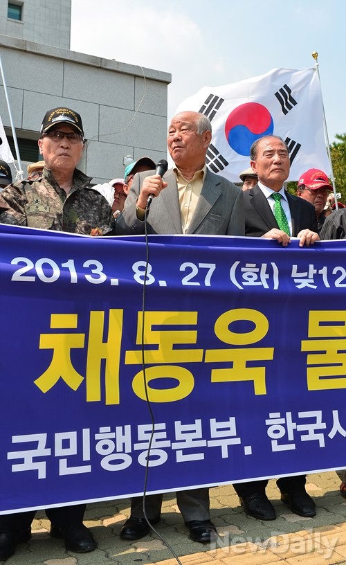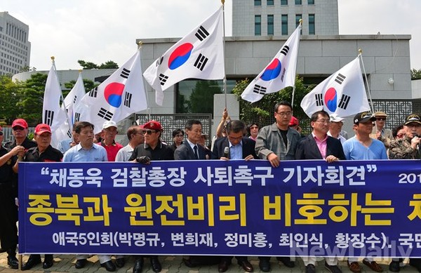 애국5인회<변희재> 미디어워치 대표,<황장수> 미래경영연구소 소장,<정미홍> 정의실현국민연대 대표,<박명규> 공영방송정상화국민행동 공동대표,<최인식> 한국시민사회단체협의회 집행위원장과 <국민행동본부>, <한국시민단체협의회>가27일 정오 서울 서초동 대검찰청 앞에서[촛불총장 채동욱 사퇴촉구 기자회견]을 갖고 채동욱 검찰총장의 사퇴를 촉구했다.