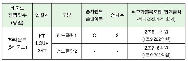 각 사업자의 주파수 낙찰 금액은 아니다.