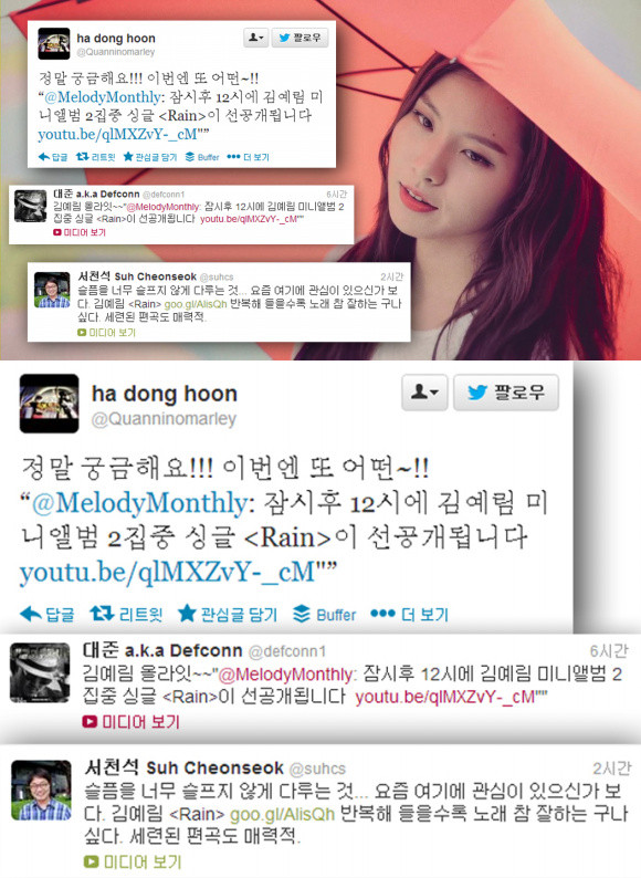 또, 하하는 선공개 곡 [Rain]을 듣고 “정말 궁금해요!!! 이번엔 또 어떤?”라는 글을 게재하며 향후 발매될 미니앨범 2집에 대한 궁금증을 드러냈다. 이어 가수 데프콘은 자신의 트위터에 “김예림 올라잇~”이라는 글을 남기며 [레인]의 성공을 기원했다.