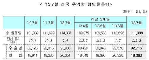 해양수산부(장관 윤진숙)는 올 7월 전국 무역항에서 처리한 항만물동량은