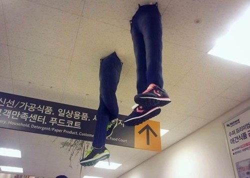 공개된 사진은 한 대형마트의 모습을 촬영한 것으로 청바지에 운동화를 신고 있는 2개의 마네킹 다리가 천장에 부착돼 있는 모습이 담겨 있다. 특히, 마치 사람이 천장을 뚫고 나오는 듯한 모습을 연출해 보는 이들에게 놀라움을 안긴다.