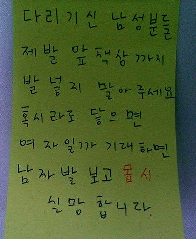 공개된 사진에는 도서실에서 누군가 붙여놓은 쪽지 한 장이 담겨 있다. 해당 쪽지에는 “다리 긴 남성분들 제발 앞 책상까지 발 넣지 말아주세요. 혹시라도 닿으면 여자일까 기대하면 남자 발 보고 몹시 실망합니다”라는 내용이 적혀 있어 눈길을 끈다.