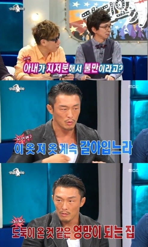 이날 추성훈은 “아내가 지저분해서 불만이라던데?”라는 MC들의 질문에 “맞다. 아내가 모델이니까 외출하기 전에 이옷 저옷 입는다”고 밝혔다.