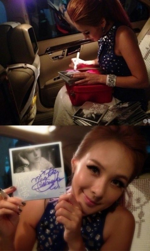 가수 채연의 폭풍 싸인 모습이 공개됐다.채연은 28일 자신의 웨이보에 “장소 문제로 어쩔 수 없이 싸인회를 취소했어요. 정말 아쉬워요. 지금 열심히 싸인 하고 있어요. 여러분 손에 들어가길 바라요“라는 글과 함께 사진을 게재했다.
