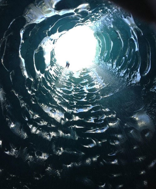 공개된 사진은 미국 알래스카 쥬노 인근의 멘델 홀 빙하에 수직으로 뚫린 구멍 속에 사람이 들어가 촬영했다. 구멍의 깊이는 건물 18층 높이에 해당하는 55m로 그 깊이가 대단한 것으로 알려졌다.
