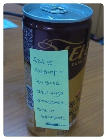 공개된 사진에는 캔커피에 쪽지가 붙어 있는 모습이 담겨 있다. 쪽지에는 “음료수 잘 먹었습니다. 힘이 났네요. 열심히 하시고요. 감기 조심하세요”라고 화답했다.