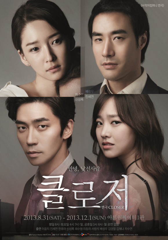 연극 <클로저>가 오는 31일 대학로 아트원씨어터 1관에서 막을 올리며 3개월간의 대장정을 시작한다.대한민국 최고의 스태프진과 배우들이 의기투합한 연극 <클로저>는 지난 8월 초 개막 소식과 함께 캐스팅이 발표되자마자 언론과 관객들의 뜨거운 관심을 불러일으켰다.