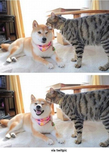 공개된 사진에는 귀여운 개와 고양이의 다정한 모습이 담겨 있다. 사진 속 고양이는 개에게 다가가 마치 귀에 무언가를 속삭이고 있는 듯하다. 이어 다음 사진에서 개는 고양이의 이야기를 듣고 활짝 웃고 있어 궁금증을 자아낸다.