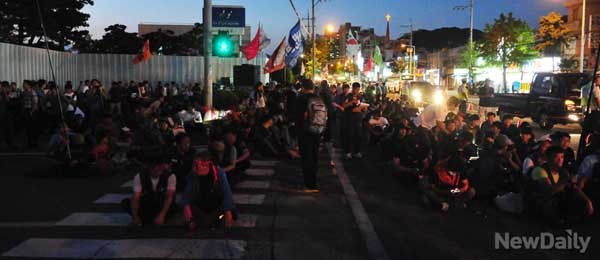 시위대 후미에서는 [술판]이 벌어졌다. -