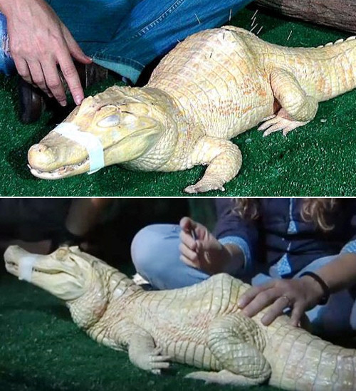 알비노 악어인 [비노]는 척추 측만증을 앓고 있어 치료를 위해 일주일에 한 번씩 침 시술을 받고 있는 것으로 알려졌다. 사진 속 [비노]는 침 바늘이 딱딱한 등 껍질을 꽂힐 때마다 움찔거렸지만 비교적 편안하게 치료를 받았다.