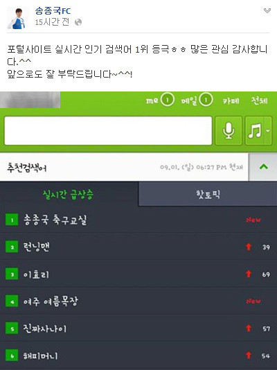 송종국 축구교실이 폭발적인 관심에 감사의 뜻을 전했다.송종국 축구교실은 2일 오전 공식 페이스북을 통해 “포털사이트 실시간 인기 검색어 1위 등극. 많은 관심 감사합니다. 앞으로도 잘 부탁드립니다”라는 글과 함께 [송종국 축구교실] 실시간 1위 캡처 사진을 올렸다.