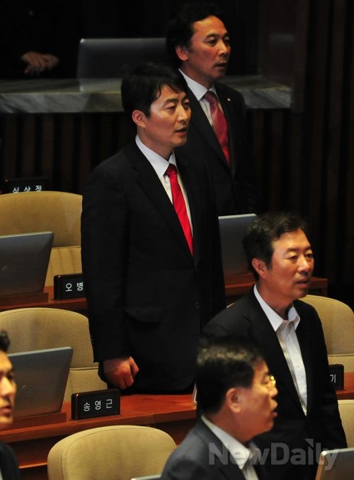 [내란음모 혐의]로 체포동의안 상정을 앞두고 있는 통합진보당 <이석기> 의원이 2일 오후 여의도 정기국회 개회식에굳은 표정의로 애국가를 부르고 있다.