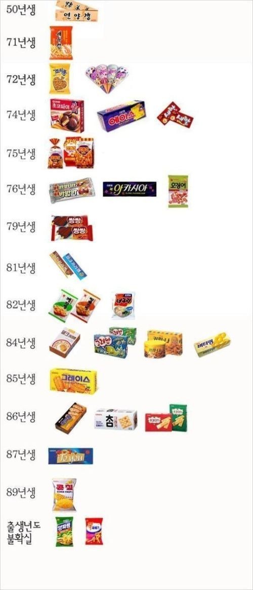 다음으로 1971년 새우깡, 1972년 죠리퐁, 1974년 초코파이, 1975년 맛동산, 1976년 오징어 땅콩… 1989년 콘칲 등이 뒤를 이었다. 양파링과 꿀꽈배기는 출생연도가 불확실하다고 적혀 있어 눈길을 끈다.