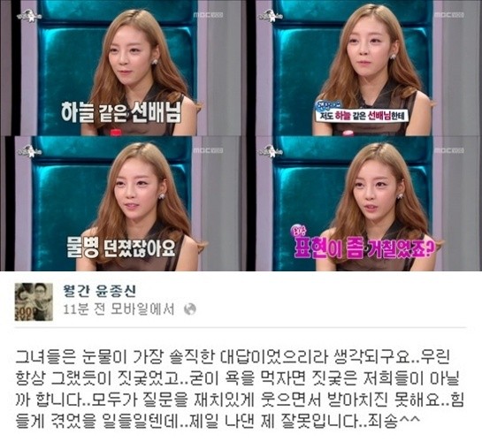 구하라 태도 논란에 <라디오스타> MC 윤종신이 해명했다.윤종신은 5일 [월간 윤종신] 페이스북을 통해 “그녀들은 눈물이 가장 솔직한 대답이었으리라 생각되고요. 우린 항상 그랬듯이 짓궂었고. 굳이 욕을 먹자면 짓궂은 저희들이 아닐까 합니다”라는 글을 남겼다.