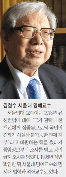 1970년대에 유신헌법을 정면 비판했다가 수난을 겪었던 원로 헌법학자 김철수(金哲洙·80·사진) 서울대 명예교수는 5일 “통합진보당에 대한 정당 해산 제소가 가능하다”고 말했다. 김 교수는 이날 전화 인터뷰에서 “주체사상을 신봉하고 이에 따라 행동하는 정당은 (헌법상의) 민주적 기본 질서에 위배되기 때문에 정당으로 보호할 필요가 없다”고 말했다.