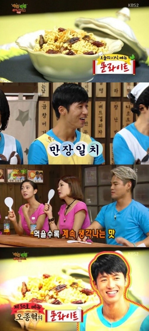 오종혁은 “집에서 밤에 혼자 맥주를 마시다가 생라면과 문어다리를 한 번에 먹고 싶어서 섞어봤다”며 “나는 요리를 잘 못하는데 이건 간편하게 만들 수 있다”고 탄생 비화를 공개했다.