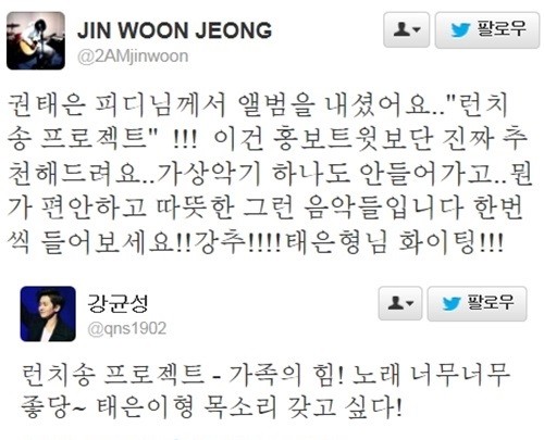 응원하는 트윗들이 눈길을 끌고 있다.2AM의 막내 진운과 노을의 강균성,