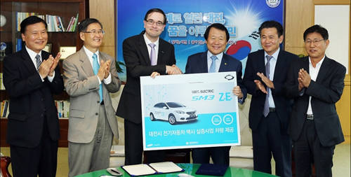 대전택시조합 등과 [전기택시 도입 실증사업 추진 양해각서]를 맺었다.▲강성모 카이스트 총장(왼쪽에서 두번째) 프랑수와 프로보 르노삼성 대표(세번째) 염홍철 대전시장(네번째)이 업무협약을 맺고 있다.