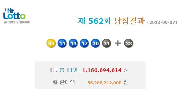 2013년 9월 7일 실시된 제562회 나눔로또 1등 당첨번호는 ‘4, 11, 13, 17, 20, 31’이며, 2등 보너스 번호는 33번이다.