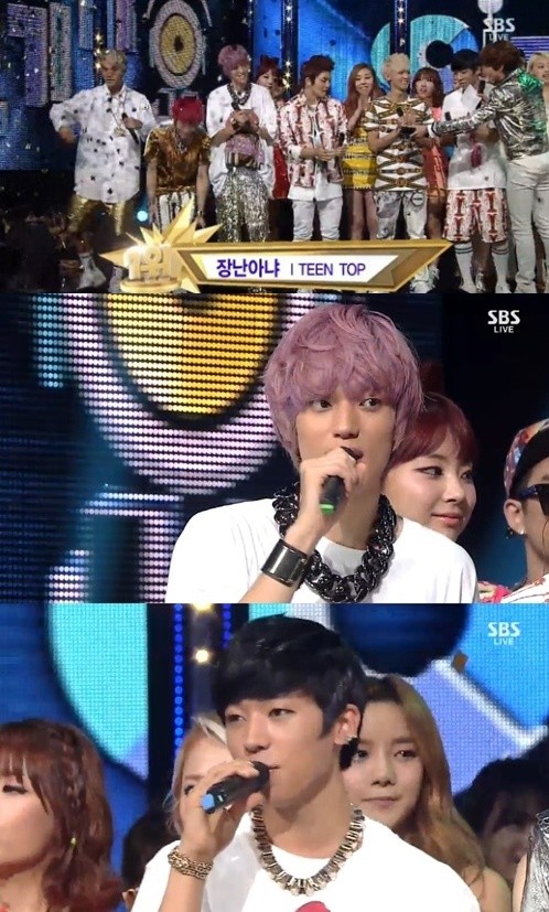 틴탑은 8일 오후 방송된 SBS <인기가요>에서 걸그룹 에프엑스 [사랑니], 선미의 [24시간이 모자라]를 제치고 [장난 아냐]로 9월 둘째 주 1위에 올랐다.