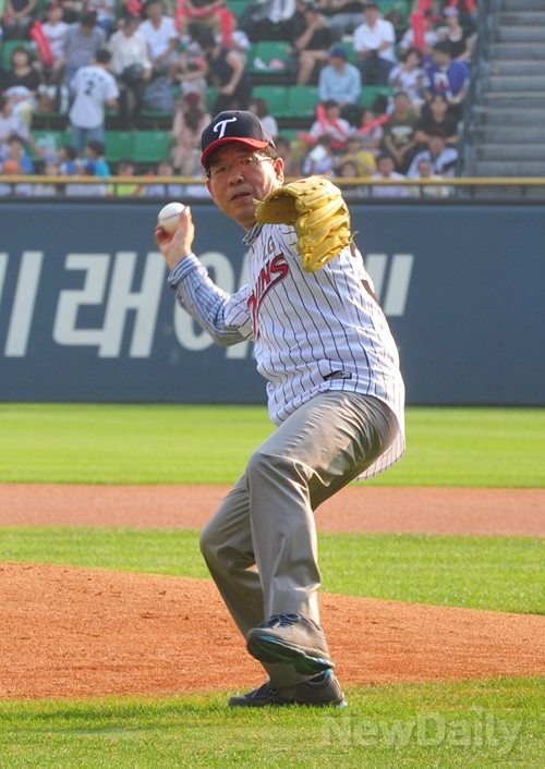 [LG트윈스] 유니폼을 입고 시구를 하고 있다.