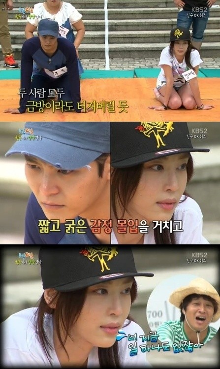 무릎을 꿇고 앉아 진지하게 대결에 임한 주원과 강예원은 감정을 잡기 시작했고, 그 결과 주원이 먼저 눈물을 떨어뜨렸다. 반면 강예원은 “너 지금 상황을 생각해. 너 지금 일 하나도 없잖아”라는 차태현의 방해로 눈물을 흘리는 데 실패했다.