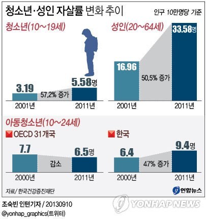 한국의 청소년층 자살률은 급증 추세라고 밝혔다.OECD 31개국의 [아동청소년](10∼24세) 자살률 통계를 보면