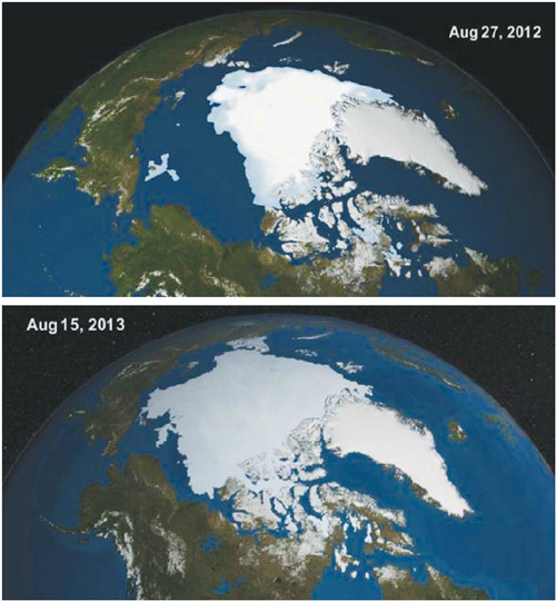 북극 빙하가 지난 1년 사이 60% 증가한 것으로 나타났다.영국 일간지 데일리메일은 “지난 8월 미국 항공우주국(NASA)이 찍은 위성사진을 지난 2012년 8월 촬영한 사진과 비교한 결과 북극 빙하 면적이 약 92만 평방마일 늘었다”고 밝혔다.