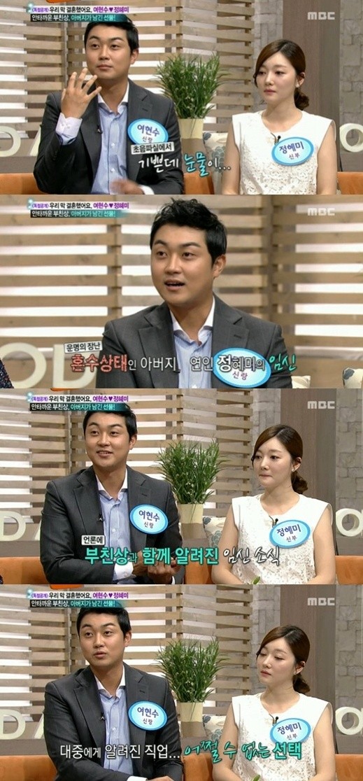 배우 여현수가 정하윤의 혼전임신 사실을 숨길 수밖에 없는 이유를 털어놨다.11일 오전 방송된 MBC <기분 좋은 날>에는 지난 8일 결혼식을 올린 여현수-정하윤 부부가 출연해 결혼 비하인드 스토리를 공개했다.
