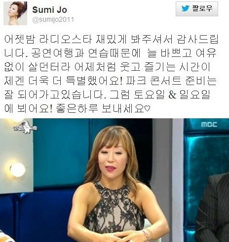 성악가 조수미가 라디오스타 출연 소감을 전했다.조수미는 12일 자신의 트위터에 “어젯밤 라디오스타 재밌게 봐주셔서 감사드립니다. 공연여행과 연습 때문에 늘 바쁘고 여유 없이 살던 터라 어제처럼 웃고 즐기는 시간이 제겐 더욱 더 특별했어요!”라는 글을 게재했다.