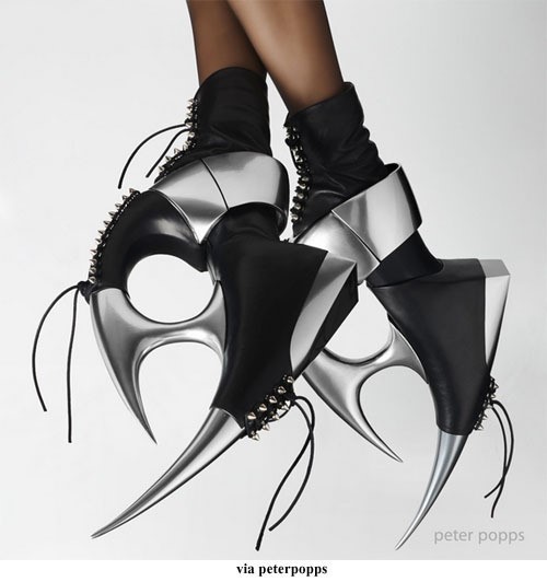 또, 굽이 날카로워 신고 걷지 못할 뿐만 아니라 서 있기도 힘들어 보인다. 디자이너에 따르면 기괴한 모양의 이 하이힐은 인간을 속박시키는 현대 사회가 모티브인 것으로 알려졌다.