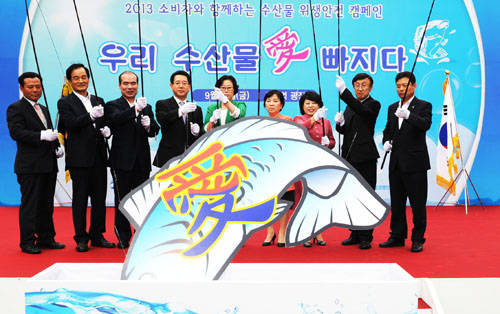 13일 서울역 광장에서 열린 [소비자와 함께하는 수산물 위생안전 캠페인]에서 윤진숙 해수부 장관, 김연화 한국소비생활연구원장, 이종구 수협중앙회장 등 참석자들이 [우리 수산물을 사랑하자]는 마음을 담아 사랑 愛자가 적힌 물고기를 낚시로 낚아 올리는 퍼포먼스를 하고 있다.