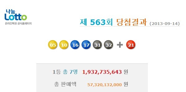 2013년 9월 14일 실시된 제563회 나눔로또 1등 당첨번호는 ‘5, 10, 16, 17, 31, 32’이며, 2등 보너스 번호는 21번이다.